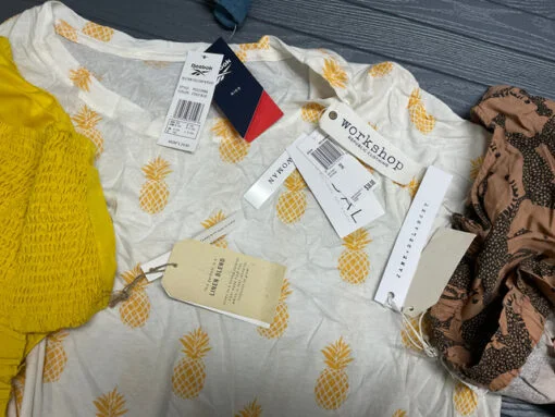 Mix Clothes Brand – 68 Stück Lot AB2064 für 300 €: Dieses Paket bietet eine vielfältige Auswahl an Markenbekleidung direkt aus Store Pulls. Die Boxen enthalten eine Mischung aus Damen-, Herren- und Kinderkleidung. Viele Artikel sind neu mit Originaletiketten (NWT), einige können leichte Handling-Spuren oder fehlende Preisetiketten aufweisen.